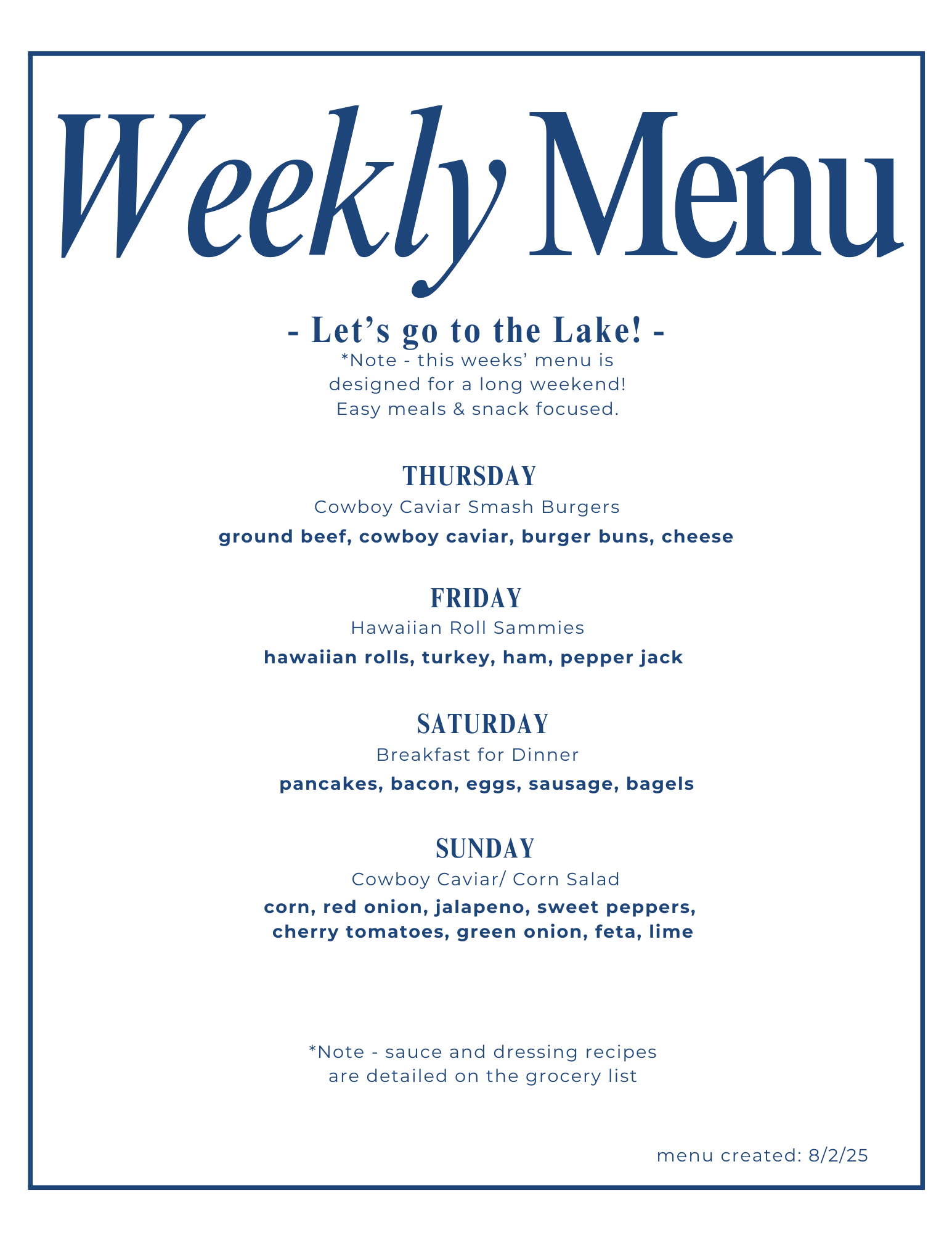 Summer in Minnesota = endless lake weekends, and that is what this weeks’ menu is designed for. A long weekend at the lake! Food that is perfect for the boat, the kids or big groups. Keeping it simple, but still bringing the crowd pleaser meal or snack! A comprehensive grocery list, and individual recipe details are included below!